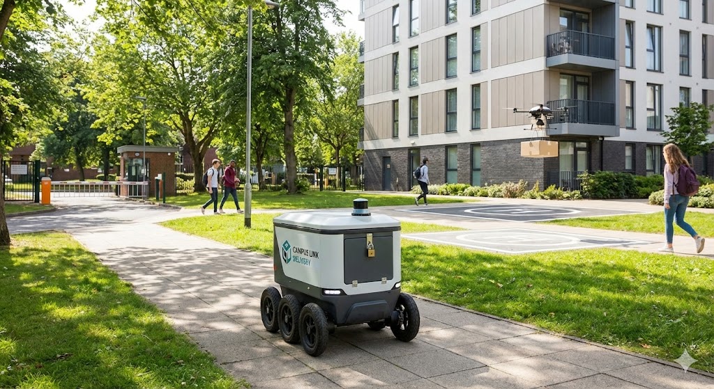 • Aplicações Típicas: Entrega de refeições (delivery de restaurantes dentro do campus), pequenas compras de conveniência, transporte de documentos entre prédios corporativos e entrega de pacotes da portaria do condomínio até a porta da casa.
